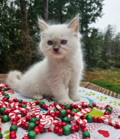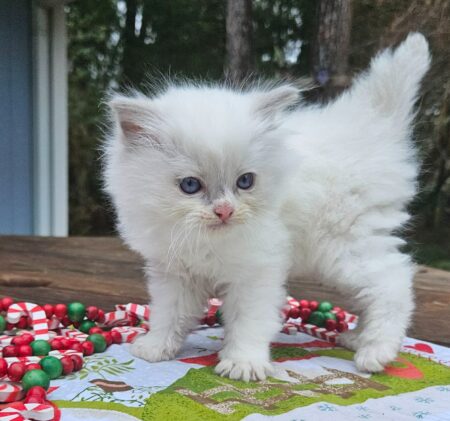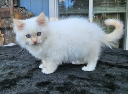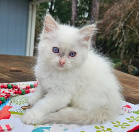This is a rare Cream Point mitted kitten. This is my first Cream Point that I have produced here at Dragon Heart Cattery. Cream is just a shade below Red. He is almost pure white with just a peachy coloring on his tail and ears. Absolutely gorgeous kitten. Born October 3, 2025 he will be ready to go anytime after neutering. TICA registered.